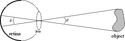 A convenient way to measure the distance between two points along the retina, or the distance between two points in visual space, is in terms of the angle between them. This angle is constructed by drawing a line from one point to the center of the lens/cornea, and then back to the other point, as shown in Figure 1.