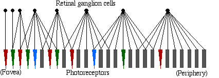 There are two crucial stages of sampling that take place in the retina. One is via the photoreceptors (rods and cones) that initially transduce light into voltage and electrochemical signals. The other is via the retinal ganglion cells which sample the outputs of the photoreceptors (after being processed by the horizontal, bipolar, and amacrine cells). While the density of photoreceptors declines somewhat with eccentricity, the density of ganglion cells falls off even more sharply. There are about 130 million photoreceptors tiling the retina, and this information is summed into only one million ganglion cells. Thus, there is a net convergence or fan-in ratio of about 100:1. The signals conveyed by the one million ganglion cells are the sole statement that the cortex gets to see from the retinal image. Were they to be tiled evenly over the 2D image, they would provide an equivalent resolution of about 1000x1000 pixels for the entire visual field (which isnt much!). Instead, they are arranged so as to obtain extremely high resolution in the fovea - sampling the photoreceptors in a one-to-one ratio - and then falling off with eccentricity, as depicted in Figure 4.