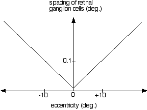 is the spacing between adjacent retinal ganglion cells, in degrees, and E is eccentricity, also in degrees. (That this is so is really quite fascinating, from an engineering viewpoint, because it provides scale-invariance. As you look at the center of your hand, the number of ganglion cells falling on each of your finger tips will be about constant, independent of viewing distance. This feature conceivably makes it easier to recognize objects amidst variations in size on the retina.)