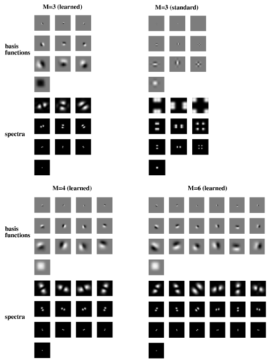 Learned basis functions ('learned') and corresponding power spectra for M=3, 4 and 6 bands, along with a standard 9/7 biorthogonal wavelet ('standard'). Each column shows a different band, while each row shows a different level. The lone basis function in the last row is the scaling function (twice convolved with itself). The power spectra are plotted in the 2D-Fourier plane (vertical vs. horizontal spatial-frequency) with the maximum spatial-frequency at the Nyquist rate.